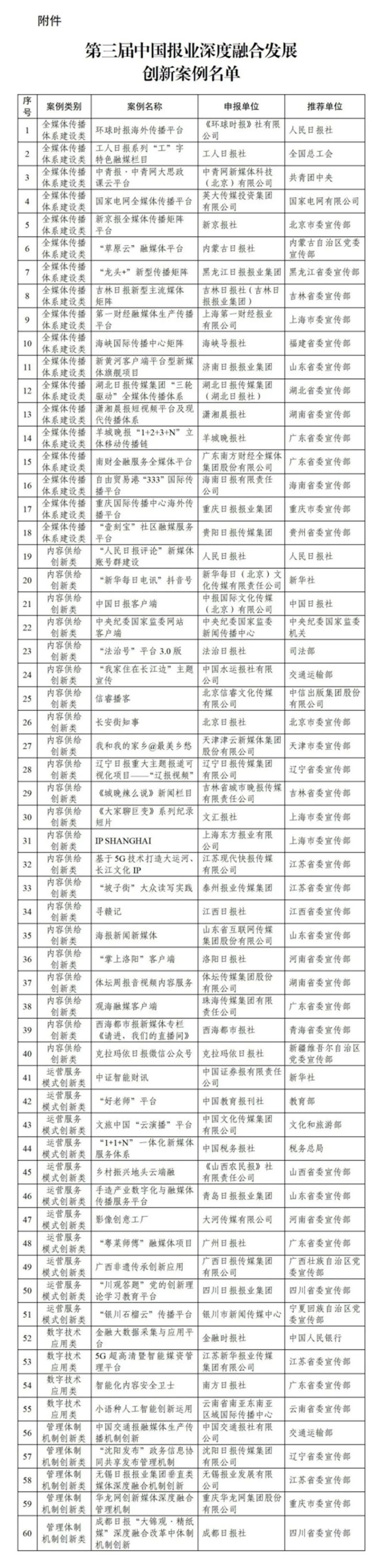 经评审,共遴选出60个创新案例,其中全媒体传播体系建设类18个,内容供给创新类22个,运营服务模式创新类11个,数字技术应用类4个,管理体制机制创新类5个。
