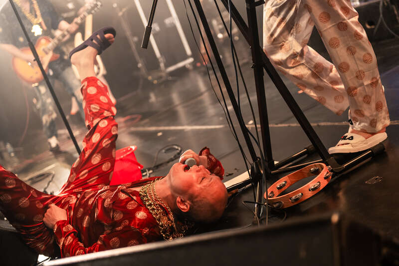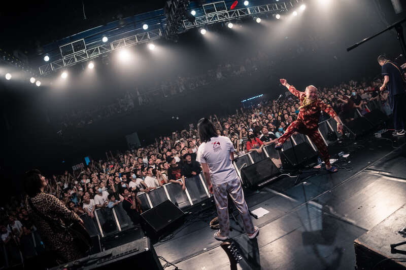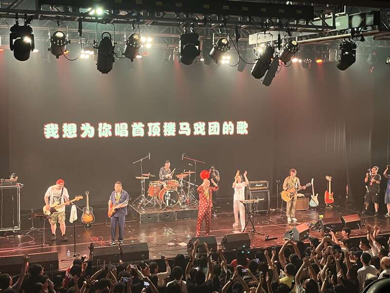 台上办睡衣派对,现场兜售主唱同款,318块钱一套。陆晨一会儿脱个金戒指,舔两下,抛给观众。一会儿又脱一个,往脚趾上蹭蹭,再抛给观众。一套金灿灿假细软不断往台下扔,“全部给你们这帮垃圾瘪三”。从红色塑料马桶里往外掏出碟片乱飞,最后马桶也飞进人群。接住马桶的眼镜男孩年纪不大,一开始还把红色马桶顶在头上。后来到底看演出不方便了,改成拿在手里。想了一会,把手里的折伞也丢进马桶。过一会再看他,马桶已经在人群里沉没。