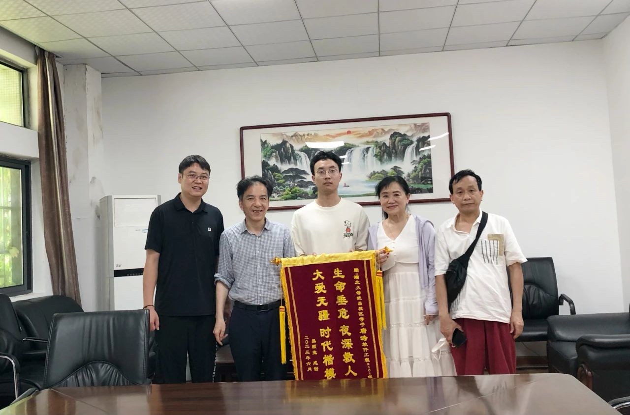昨日,刚刚出院的熊顺宝做了一面写有“生命垂危 夜深救人 大爱无疆 时代楷模”的锦旗,送到了学校。在学院领导和老师们的见证下,唐涛接受了一家人的感谢。