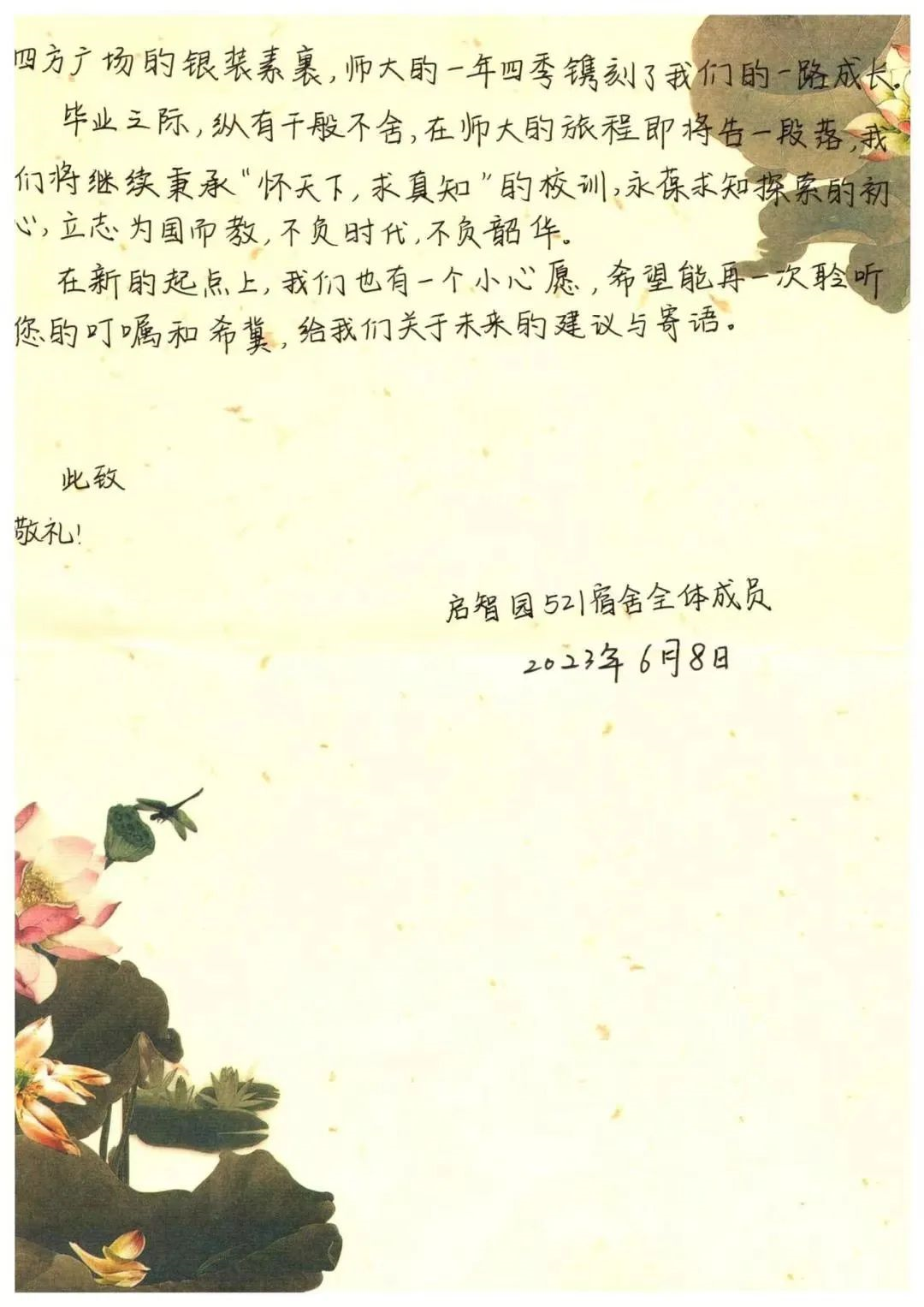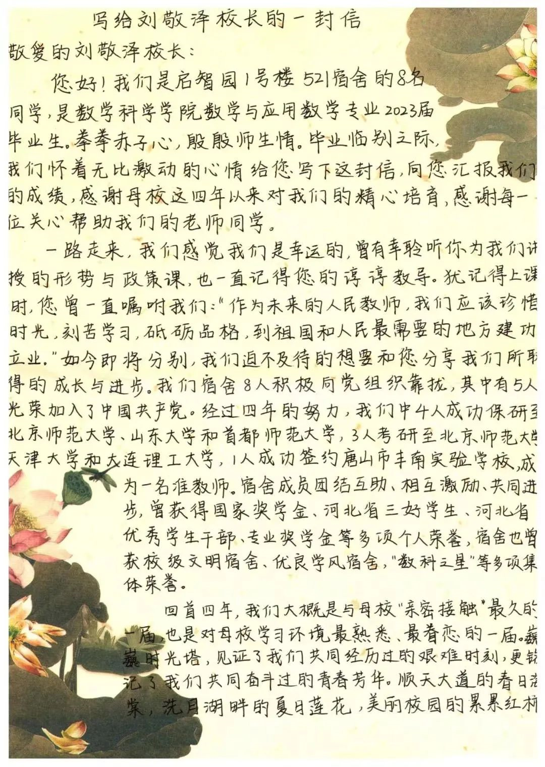 近日,数学科学学院启智园1号楼521宿舍8位2023届毕业生以“写给刘敬泽校长的一封信”的形式表达了毕业前的“微心愿”。