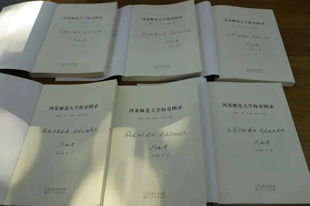 刘敬泽校长将写有这些寄语并亲笔签名的《河北师范大学校史图录》 送给了521宿舍的同学们,勉力她们牢记师大"怀天下、求真知"的校训,以优秀校友为榜样,在未来的日子里继续努力,不负国家和人民,成长为德才兼备的优秀人才。