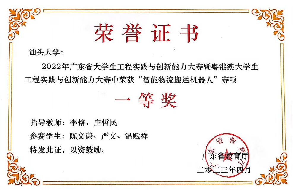 2023年3月24—25日,2022年广东省大学生工程实践与创新能力大赛暨粤港澳大学生工程实践与创新能力大赛在广东省广州市华南理工大学五山校区举行。在激烈角逐中,汕头大学“中午吃什么”队伍的温剑伟、刘京腾、姚罗然和“一个机电都没有”队伍的陈文谦、温赋祥、严文荣获智能物流搬运机器赛项一等奖。