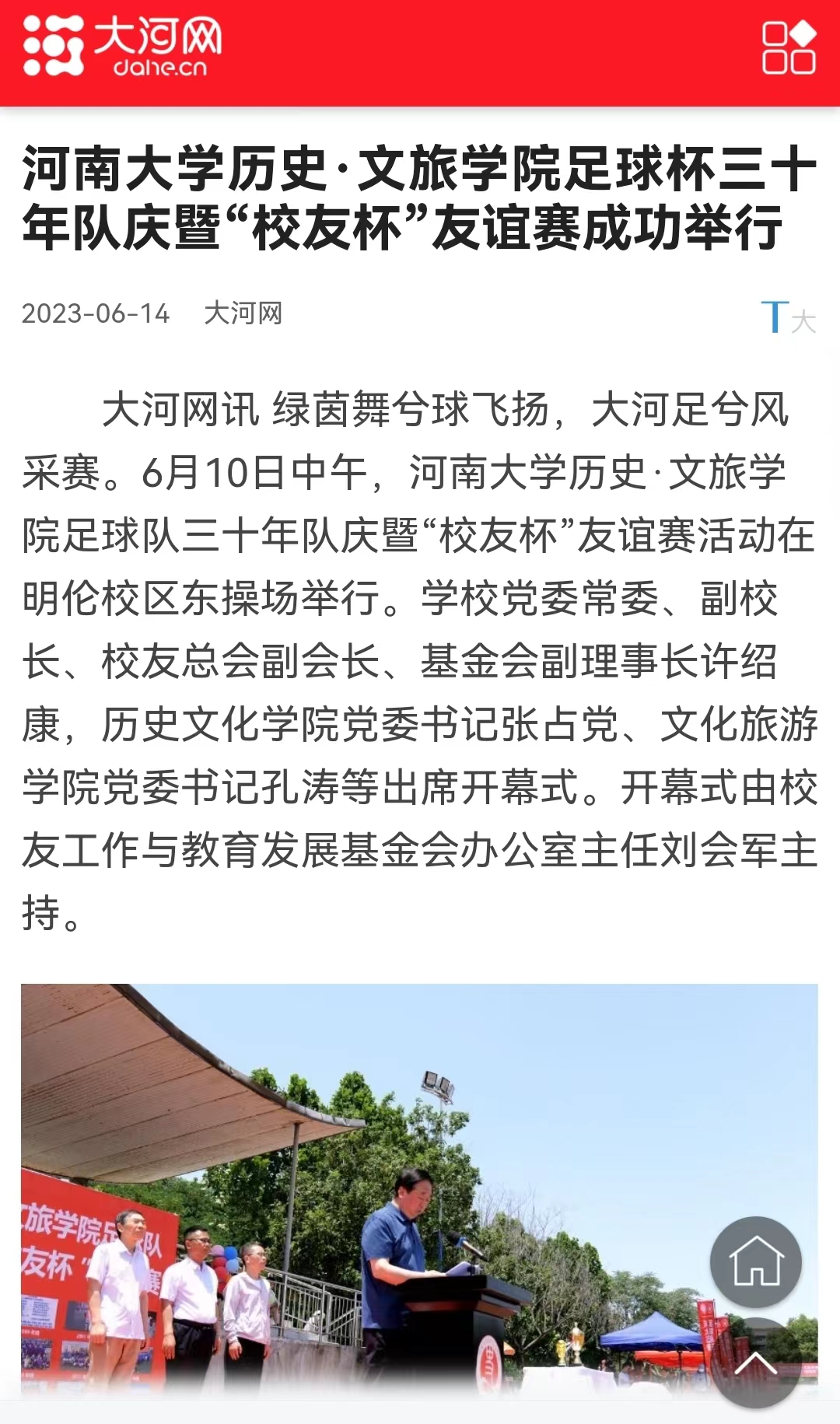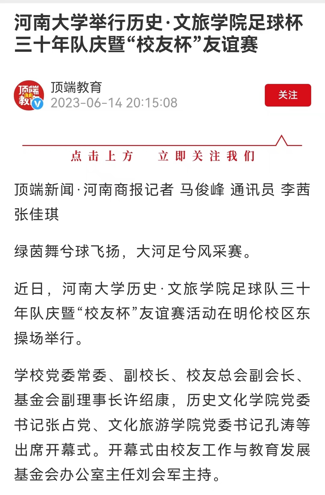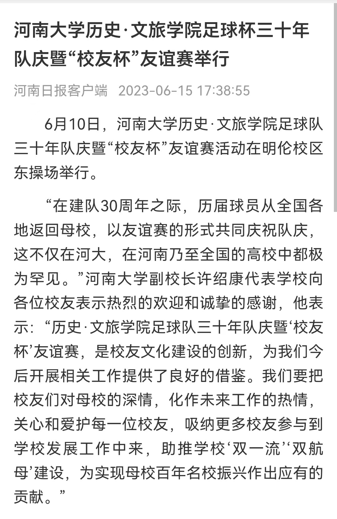 6月10日中午,河南大学历史·文旅学院足球队三十年队庆暨“校友杯”友谊赛活动在河南大学明伦校区东操场举行。