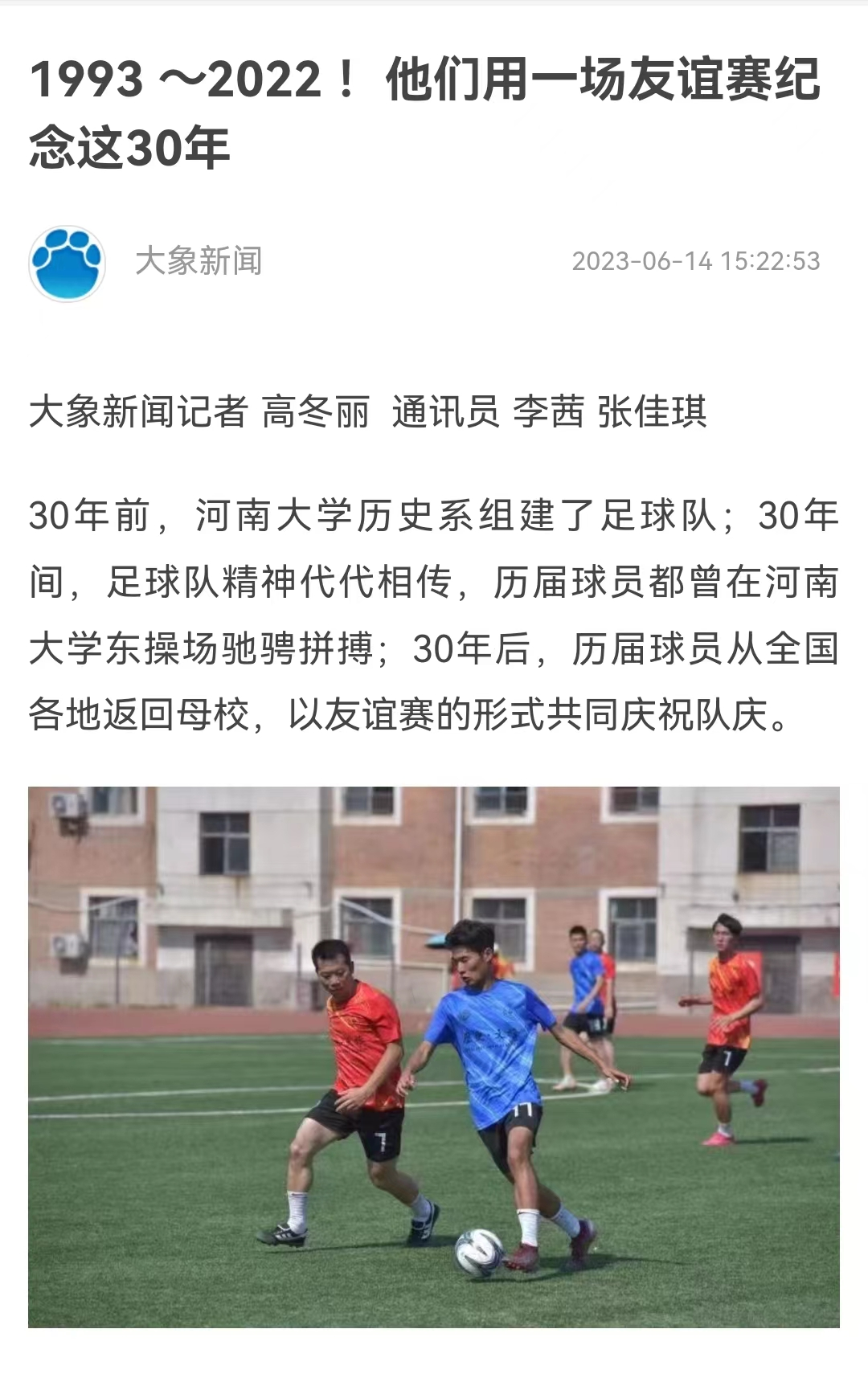 自1993年起,历史系的同学们基于同样的爱好,组建了足球队。30年间,尽管历经学院更名、专业调整等,但这支球队的队员们一直从未分离,队伍不断壮大,他们共同在河南大学东操场驰骋拼搏,挥洒汗水与激情,留下了美好的记忆,彼此间的情谊以及对母校的敬意累积成这支球队深厚的底蕴。