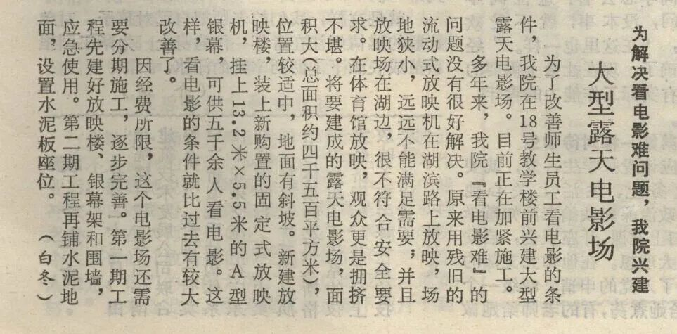 在1986年5月31日的校报上,曾报道过当时学校兴建大型露天电影场的新闻,里面提到:“多年来,我院‘看电影难’的问题没有很好解决。原来用残旧的流动式放映机在湖滨路上放映,场地狭小,远远不能满足需要,并且放映场在湖边,很不符合安全要求。在体育馆放映,观众更是拥挤不堪。将要建成的露天电影场……可供五千余人看电影。”