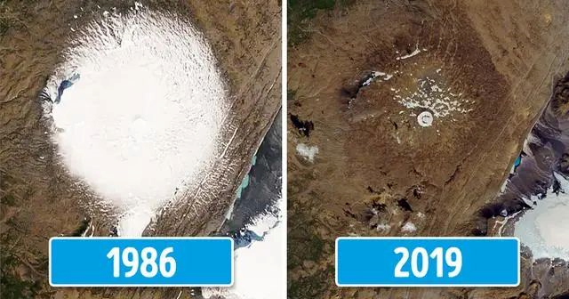 下图展示的是坐落在冰岛首都东北面的奥克冰川消融前后的卫星图片。