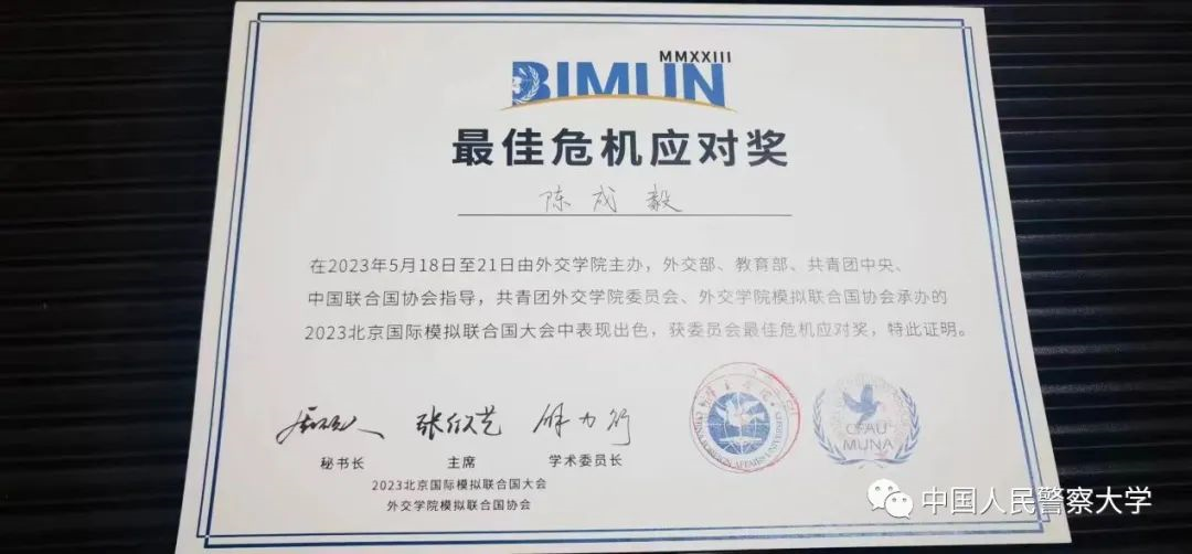 此次是我第三次参加北京国际模拟联合国大会,主题是解决苏伊士运河危机,并获得了“最佳危机应对”的奖项。除了体会到与以往一样浓厚的学术氛围外,还结交了各大高校的青年才俊,受益匪浅。在此次大会上,我不仅品尝到了模联一如既往的艰辛,也感受到了获得认可和欢呼时的喜悦。此次获奖离不开学校的大力支持与各位代表的辛勤付出,我会继续坚持走模联之路的。