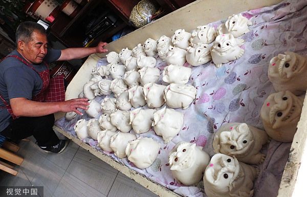2023年6月20日,山西运城,在新绛县花馍铺,捏花馍高手王引引在码放刚捏好的晋南花馍老虎馍。