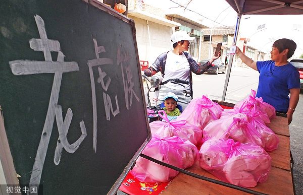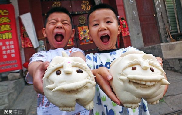 2023年6月20日,山西运城,新绛县两名小朋友展示自己在花馍铺挑选的老虎馍。