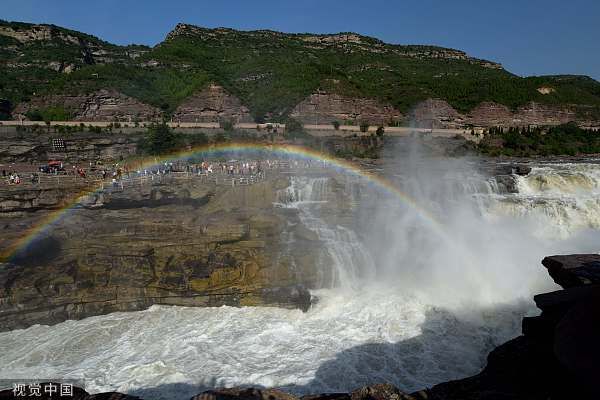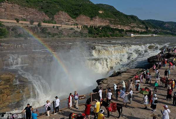 2023年6月20日,山西临汾,游客在吉县黄河壶口瀑布欣赏彩虹美景。