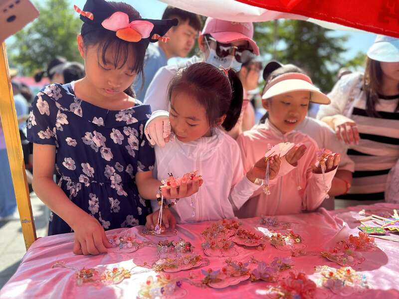 6月22日,青少年挑选喜爱的头饰。中青报·中青网记者 石佳/摄