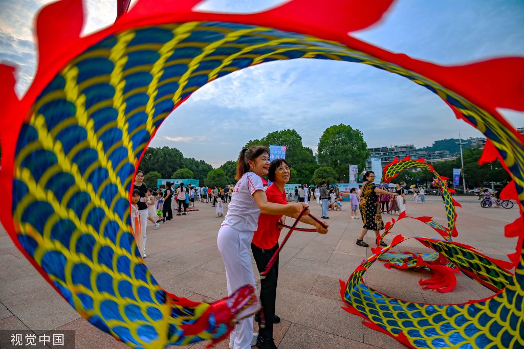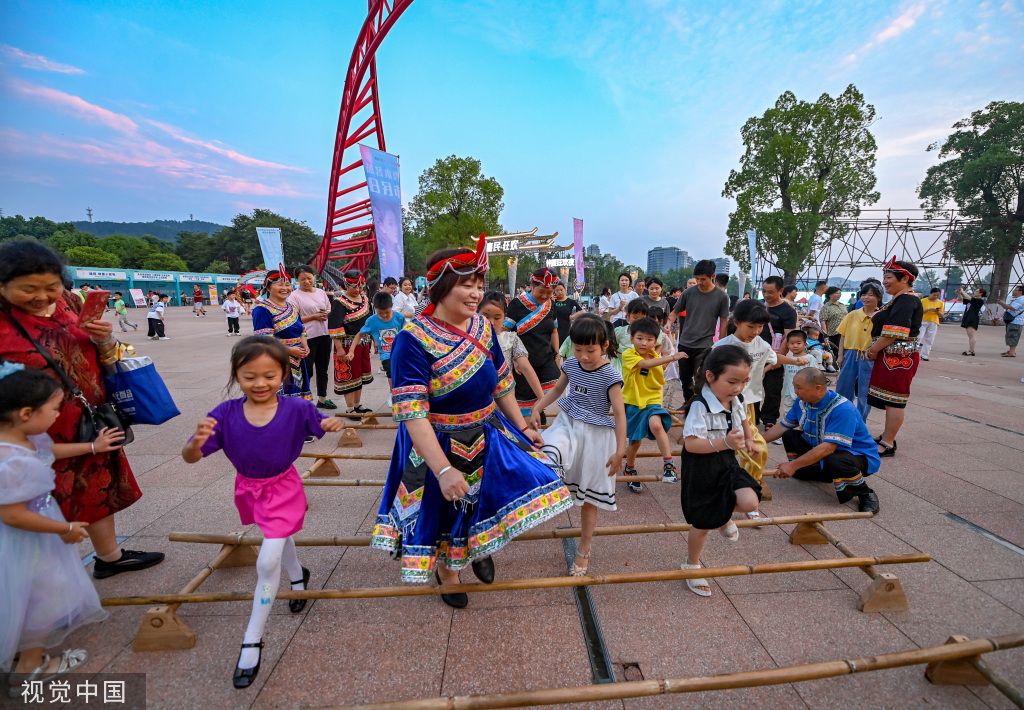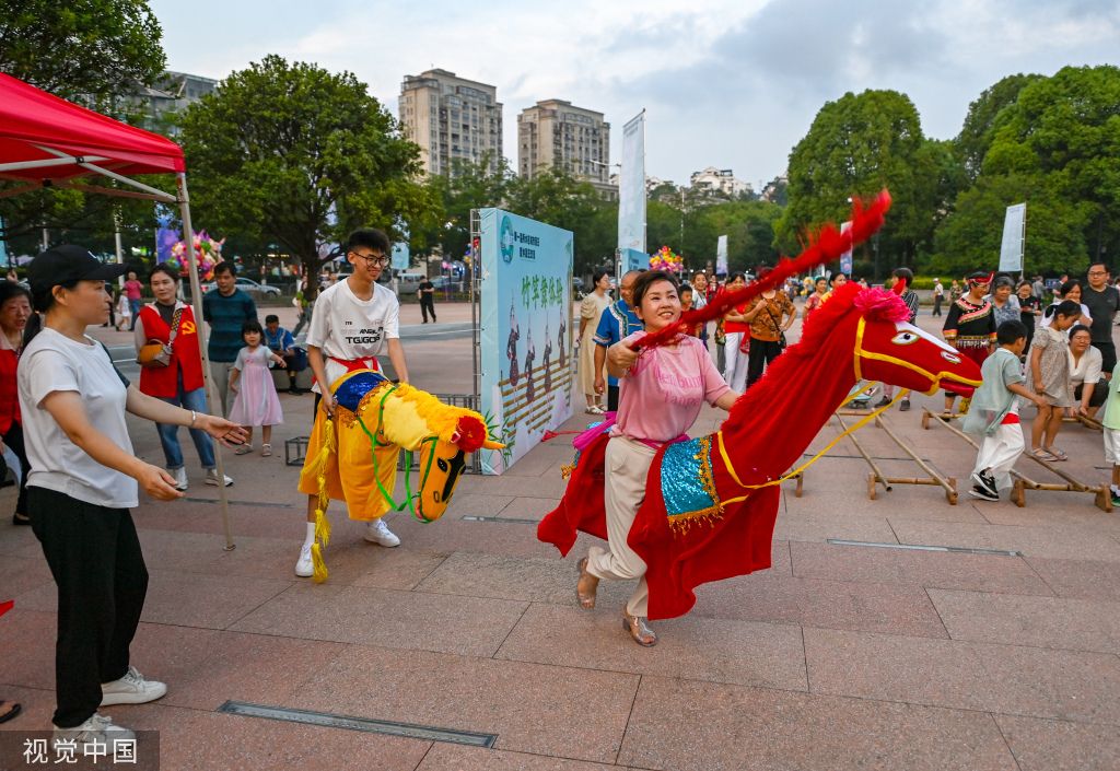 2023年6月21日,杭州,淳安县千岛湖镇秀水广场,市民通过体验竹马、竹竿舞、舞龙等非遗民俗文化,共迎端午佳节。