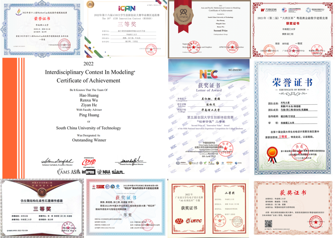 黄颢获得的一些竞赛奖项