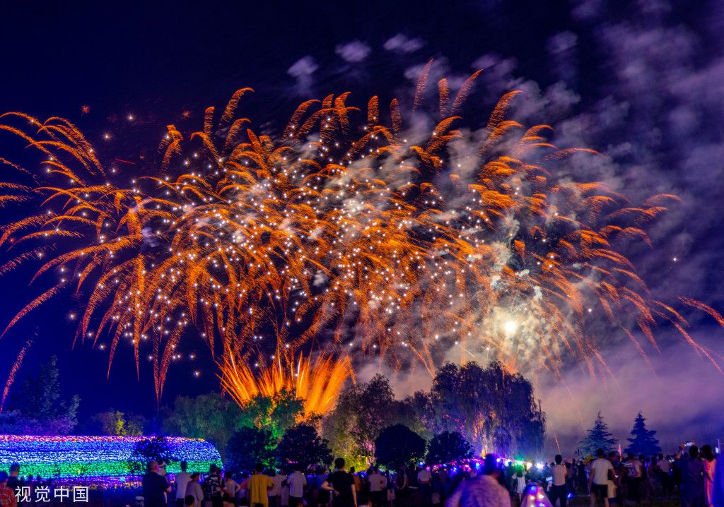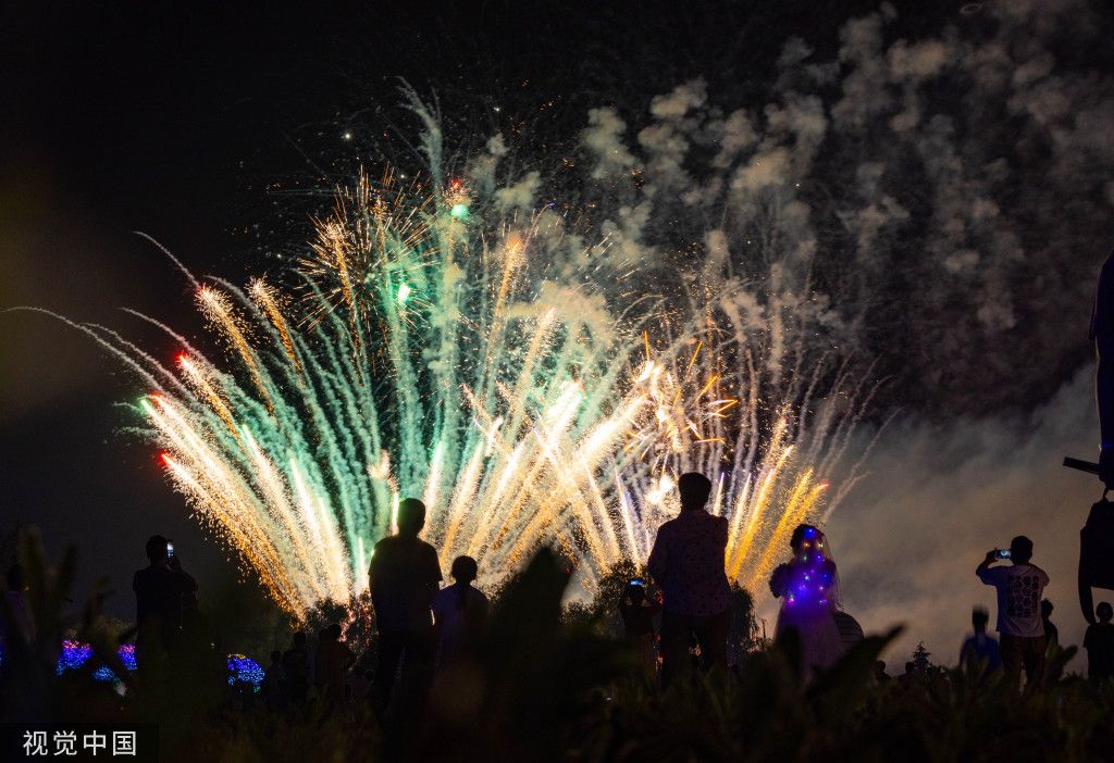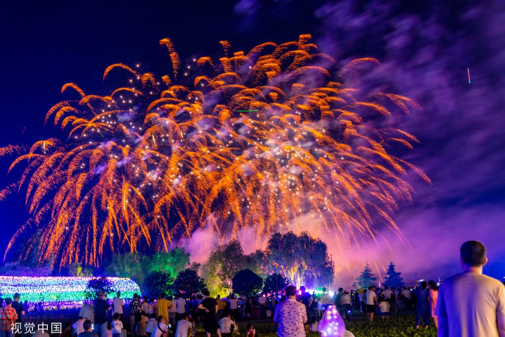 2023年6月21日,安徽淮北,游客在濉溪县百善镇柳孜文化园赏烟花、观非遗“打铁花”。