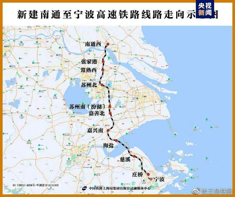 南通至宁波高铁线路自盐城至南通高铁南通西站起,向南经江苏省苏州市,浙江省嘉兴市、宁波市,引入宁波枢纽宁波站,新建线路长301公里,设计时速350公里,建设工期5年。全线设南通西、张家港、常熟西、苏州北、苏州南、嘉善北、嘉兴南、海盐、慈溪、庄桥10座车站,其中常熟西、苏州南、嘉善北、海盐、慈溪5座车站为新建车站,其他为既有车站。