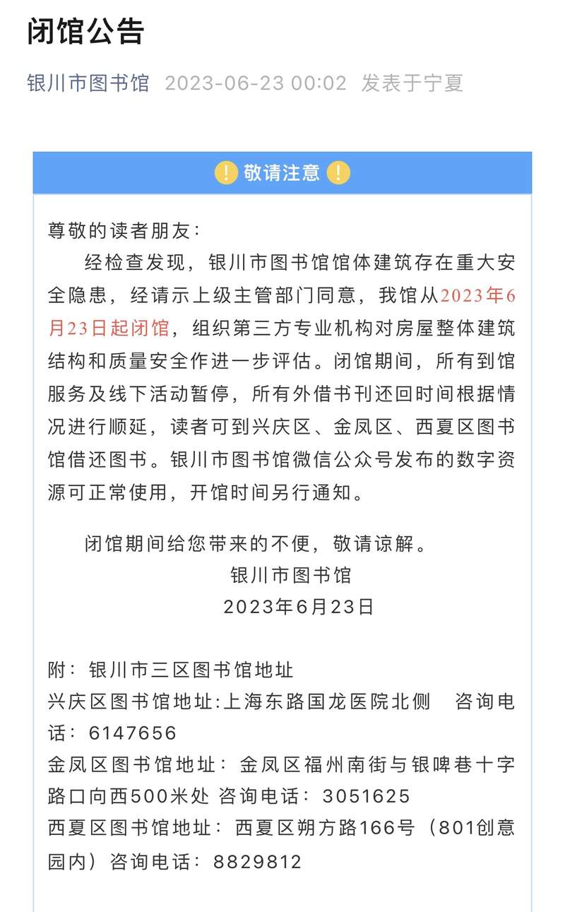 中国青年报客户端银川6月23日电(中青报·中青网记者 焦敏龙)银川市图书馆今天0时02分通过官方微信公众号发布闭馆公告称,经检查发现,馆体建筑存在重大安全隐患,经请示上级主管部门同意,从6月23日起闭馆,组织第三方专业机构对房屋整体建筑结构和质量安全作进一步评估。开馆时间另行通知。