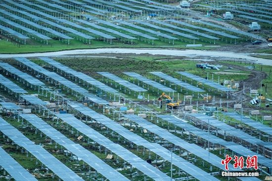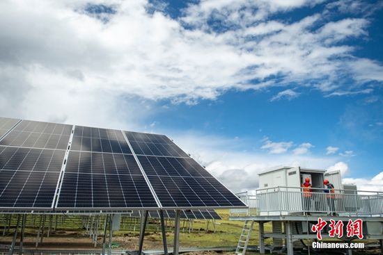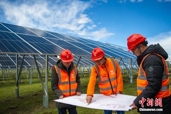 6月24日,建设者正在检查光伏设备情况。(无人机照片)