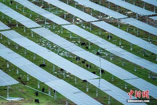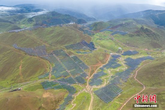 柯拉一期光伏电站是雅砻江两河口水电站“水光互补”一期项目,场址最高海拔4600米,装机100万千瓦,年平均发电量20亿度,占地2.5万亩。电站接入距离50公里、装机300万千瓦的两河口水电站,实现光伏发电和水电的“打捆”送出。图为6月24日,柯拉光伏电站场一角。(无人机照片)