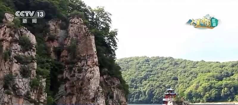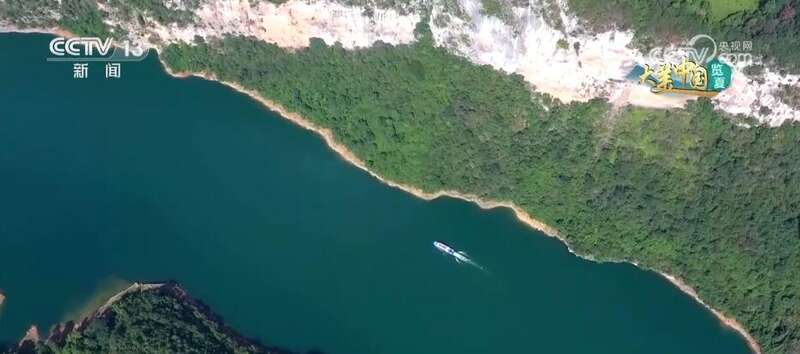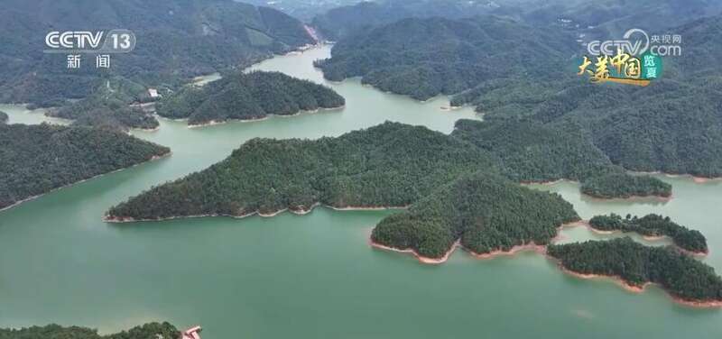 这里是江西阳明湖国家森林公园,碧绿的湖面上倒映着蓝天白云、绿树青山,构成一幅美妙的自然山水画卷。园区内湖湾数量众多,形态各异,犹如镶嵌在茫茫林海中的翡翠玛瑙。