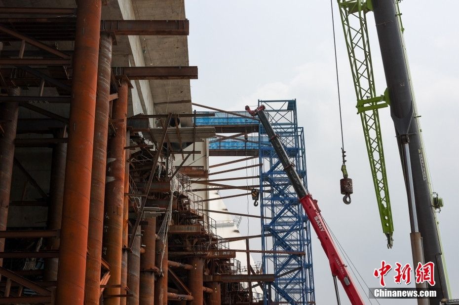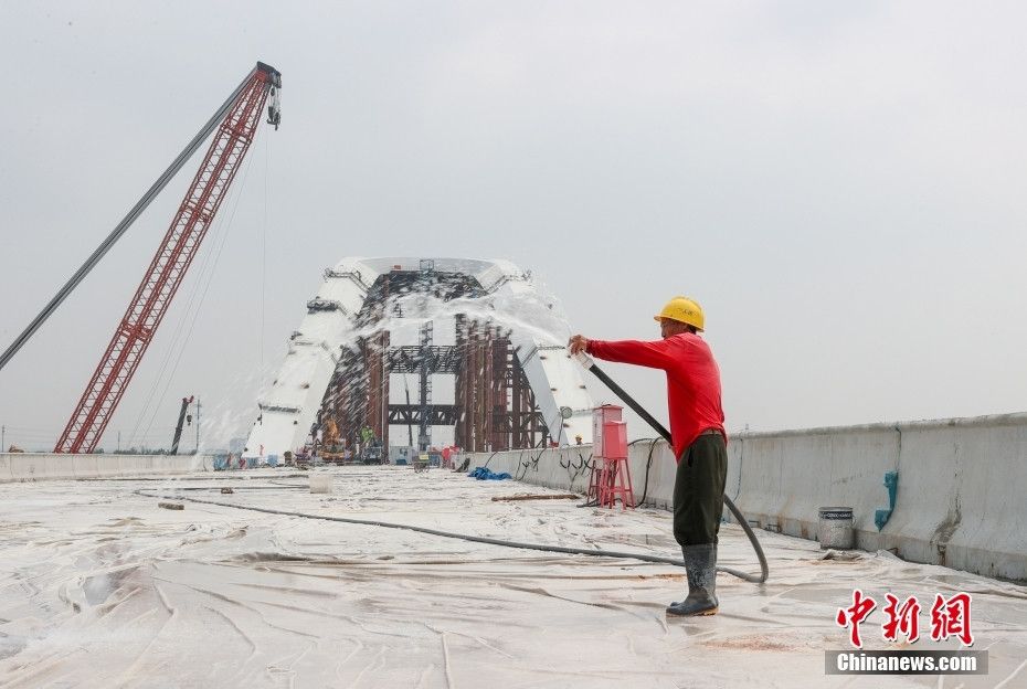 6月26日,位于北京永定河畔的京雄高速公路全线重点控制性工程——京雄大桥完成所有钢结构焊接施工,拱肋受力体系初步形成,主体结构完工进入倒计时,为京雄高速全线通车奠定了基础。图为钢结构焊接完成后,工人在桥面洒水。