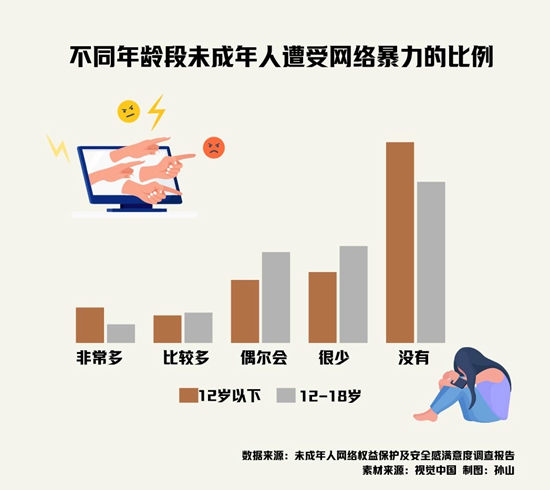 而在12岁以下受访未成年人中,15.19%在网络上遭遇过威胁恐吓,12.66%遭遇过羞辱谩骂,11.39%曾遭到电话、围观、私信等骚扰以及泄露个人或家人信息,10.13%曾被传谣言,还有不到一成受到过人肉搜索或其他形式的网络暴力。