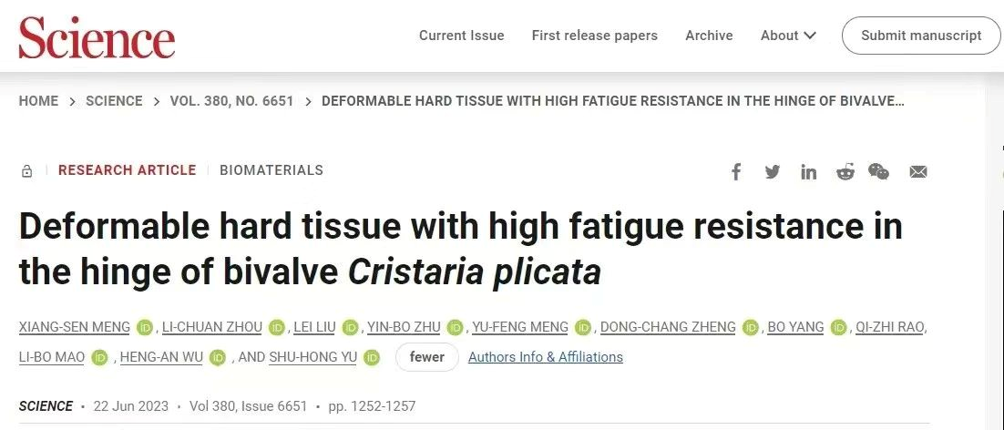 研究成果以“Deformable hard tissue with high fatigue resistance in the hinge of bivalve Cristaria plicata”为题,于6月23日发表在国际学术期刊《Science》上