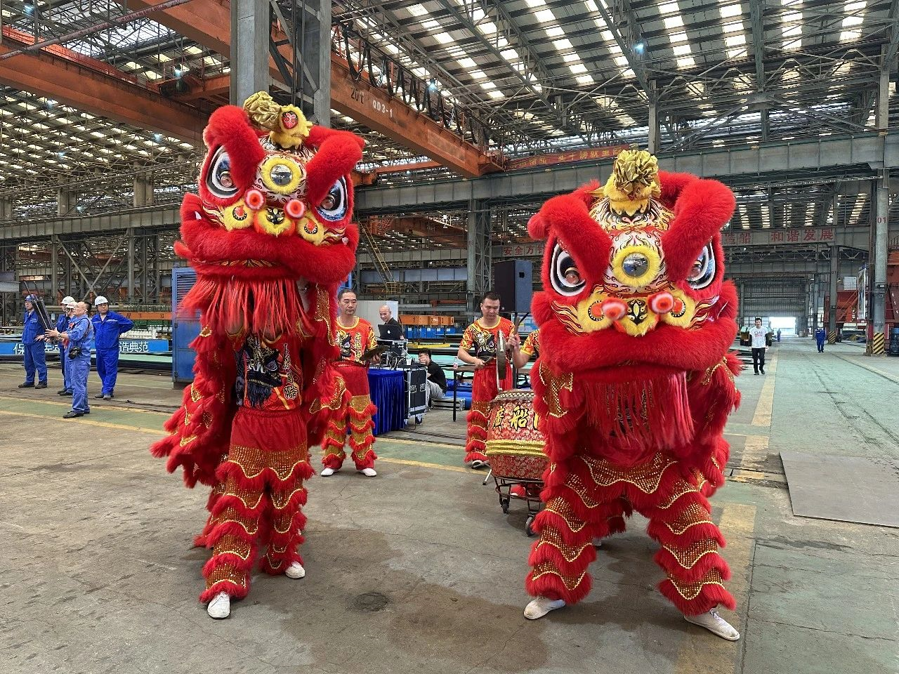 在深远海多功能科学考察及文物考古船成功启动开工仪式后,广船国际还带来了一段喜庆的舞狮表演,寓意着新船的未来与好运相伴!看准时机,萌主也赶紧走上前去合影,一起见证这一时刻!