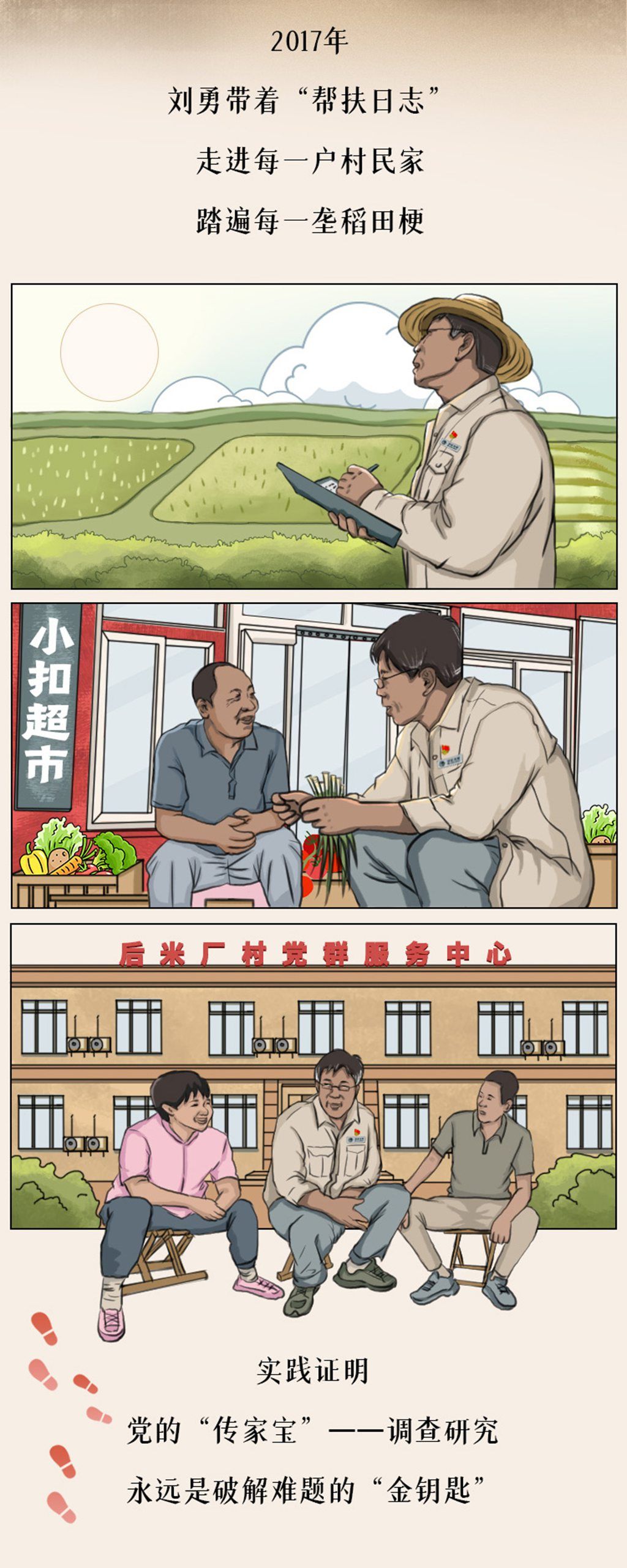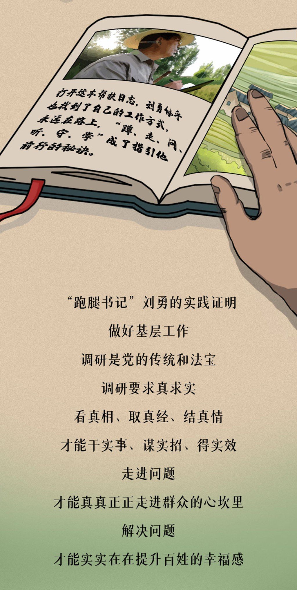 一顶草帽遮挡刺眼的阳光;一根木棍支撑多年的伤腿;一本调研笔记写满百姓的急难愁盼,长卷中,刘勇带着这“老三件”,走遍村庄的每寸土地,解决村民的每个问题,乡亲们都亲切地称他为“跑腿书记”……