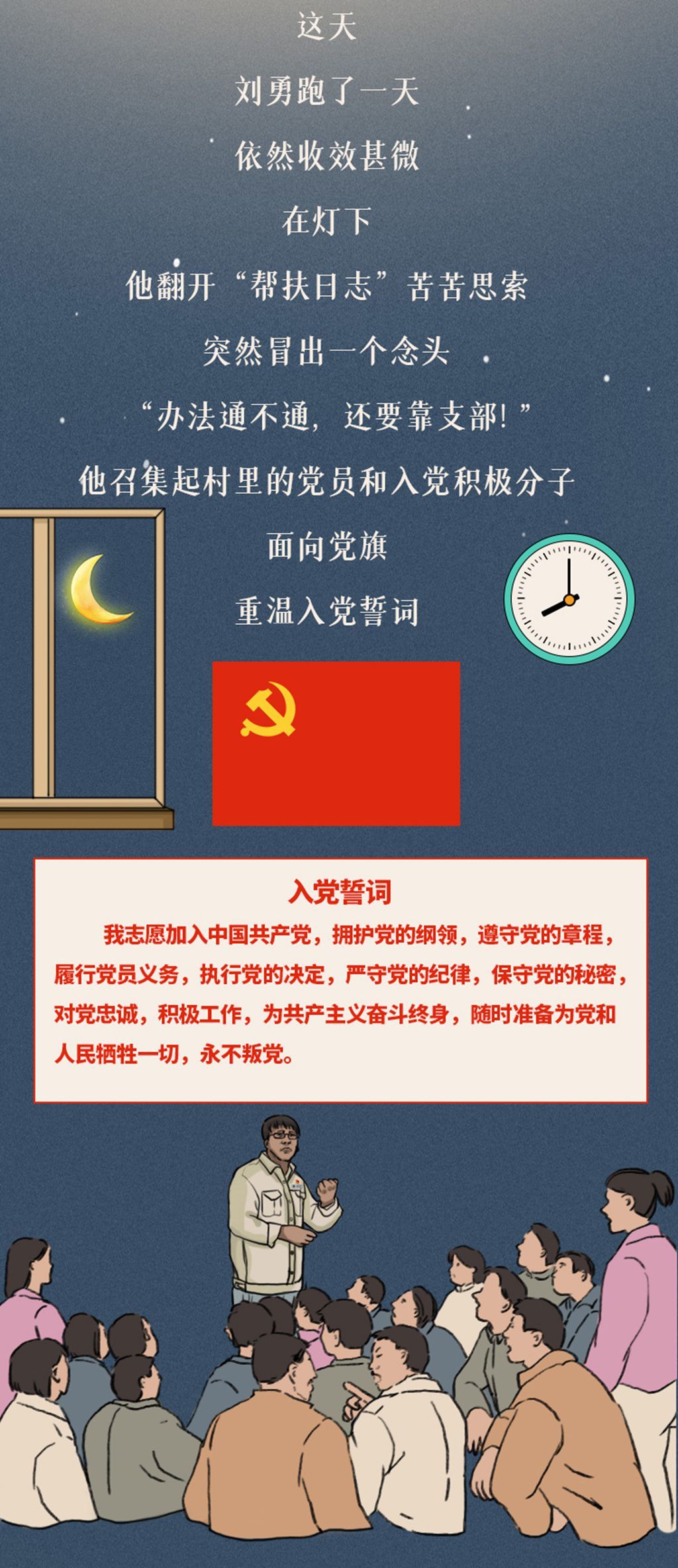 多年的户外调研,让刘勇的面庞晒得黝黑,但规整密布的新路灯却照亮了村落的黑夜。昼夜颠倒的繁忙,让皱纹爬上刘勇的眼角,而大刀阔斧的动工,则让村里的路面变得平整宽敞。在漫长的帮扶岁月里,刘勇曾带领近百位党员重温入党誓词,气势恢宏;也曾挨家挨户走访问询,细致入微。