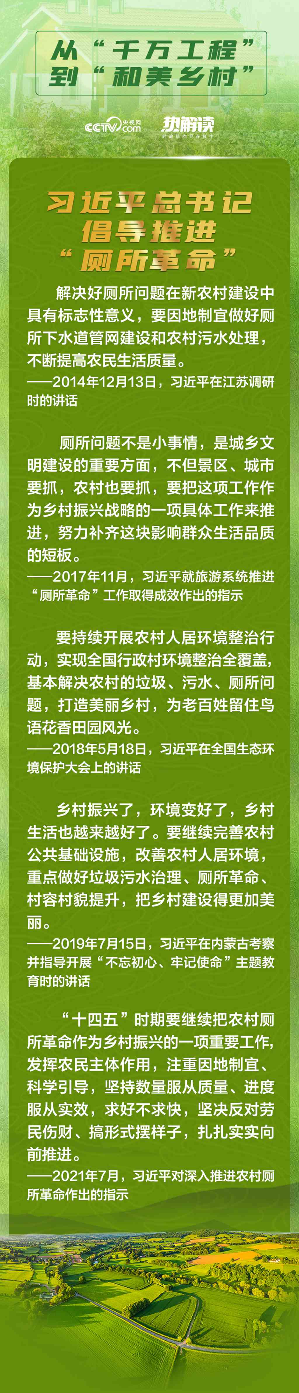 “农村改厕,这个事情是我一直关心的。我也是从农村出来的人啊,也知道农村上个厕所是真的不方便。”农村改厕,这件关系群众健康和生活文明的民生“小事”,一直是习近平总书记心中的“大事”。