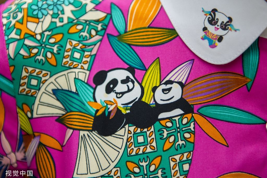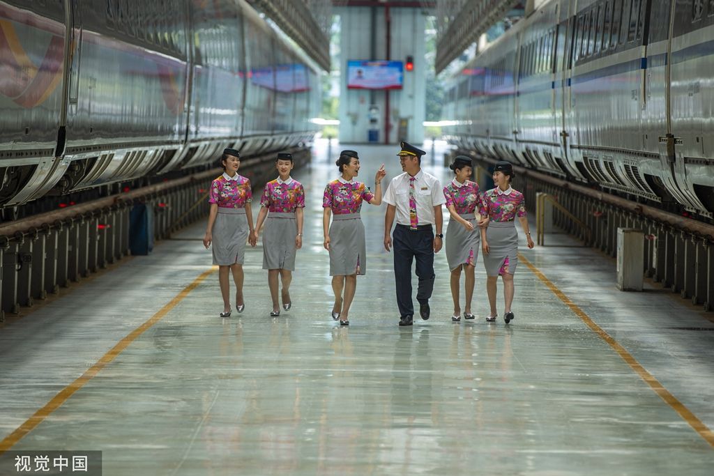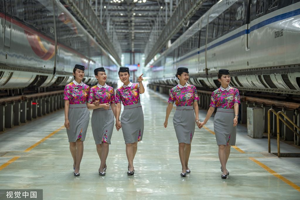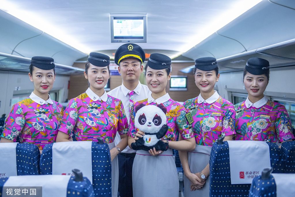 2023年6月30日,成都,蓉港高铁女乘务员均身着印有四川元素“熊猫”的工作服。当日,于7月1日开行的蓉港高铁G2963次首发列车乘组在中国铁路成都局集团公司成都动车段集体亮相。该乘组由司机、乘务员、随车机械师组成,列车采用CRH380A型动车组重联开行。 中新社记者 刘忠俊 摄