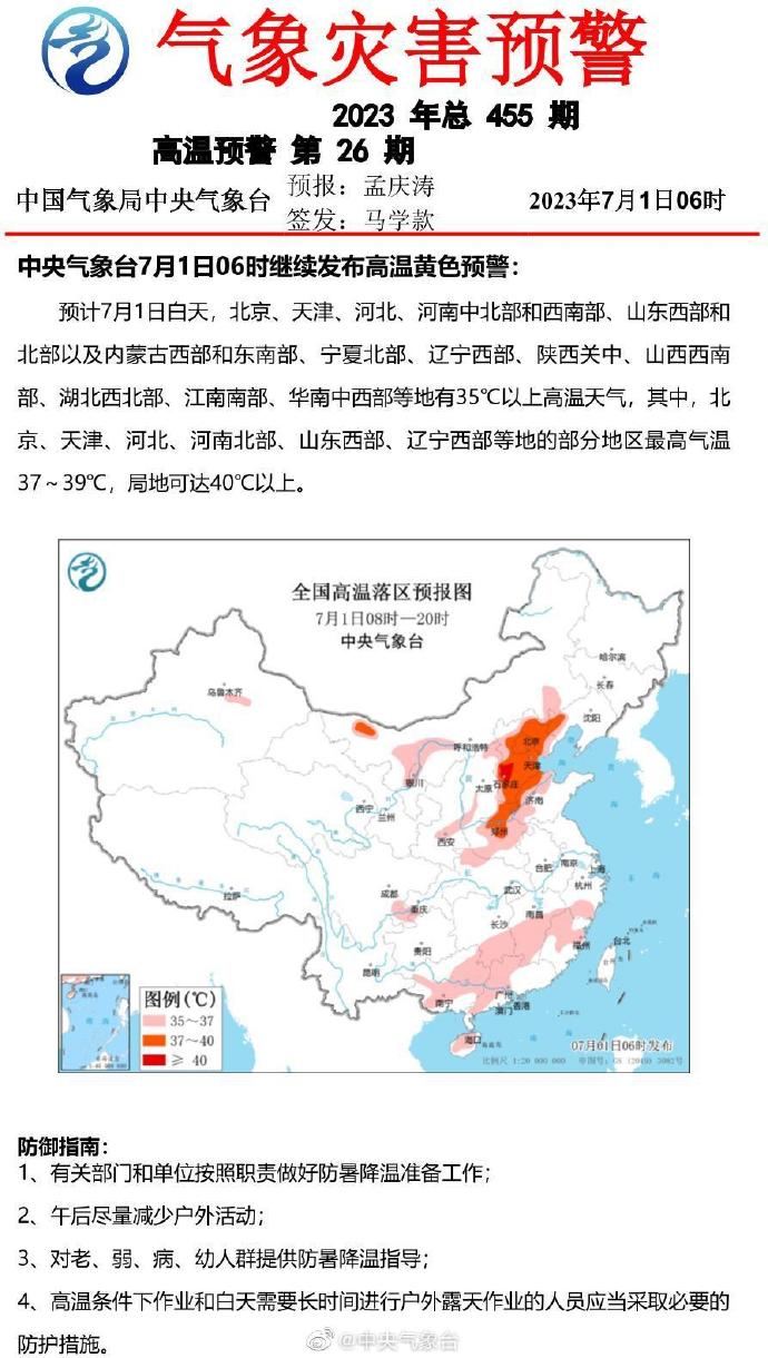 中央气象台继续发布高温黄色预警:京津冀局地气温可达40℃