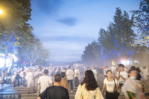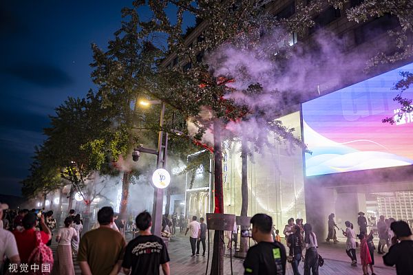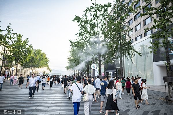 2023年7月1日,杭州,夏季来临,湖滨路通过水雾装置为行人降温。