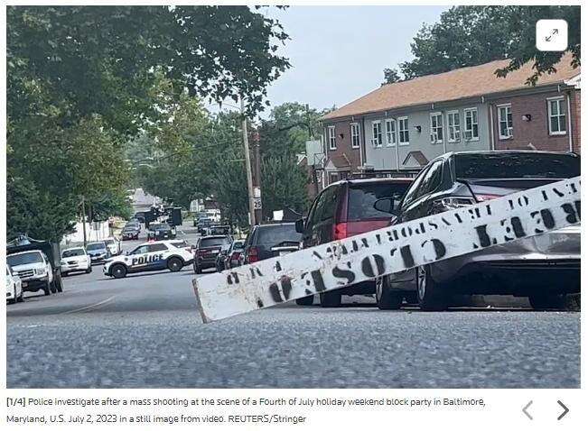 当地时间7月2日凌晨,美国马里兰州巴尔的摩的一场社区派对结束后,发生了大规模枪击事件,造成2人死亡,28人受伤,其中包括14名未成年人。图片来源:路透社报道截图