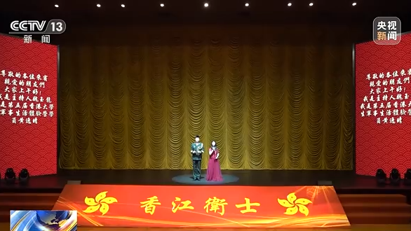 《香江卫士》主题文艺演出舞台上,身着红色礼服的香港女孩黄逸晴与驻军官兵同台主持。黄逸晴是2015年香港大学生军事生活体验营的学员,大学毕业后,她经常从事社会公益工作,把爱国精神、奉献情怀传递给更多人。