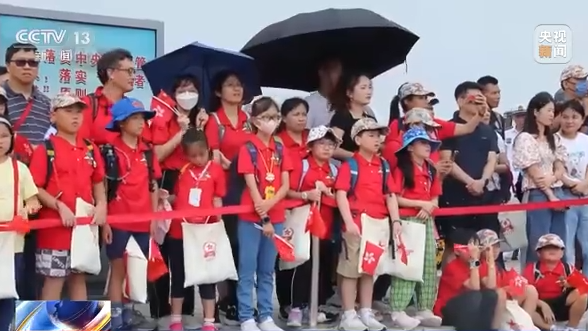 上午10时,在昂船洲军营,驻香港部队三军仪仗队迈着铿锵有力的步伐护旗而出,伴随着雄壮的《义勇军进行曲》,青少年们与解放军官兵一起升国旗、唱国歌。在随后的军事课目表演中,突降大雨,官兵们顶着暴雨为现场观众展示了军乐队列、格斗技术、刺杀操、猎人战斗等课目。