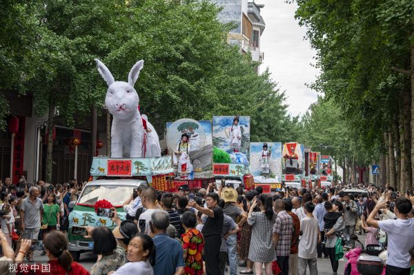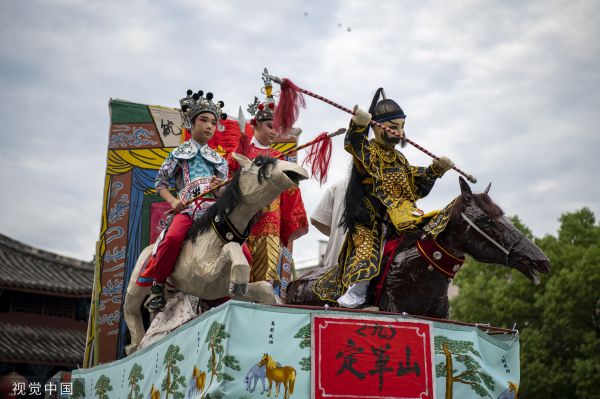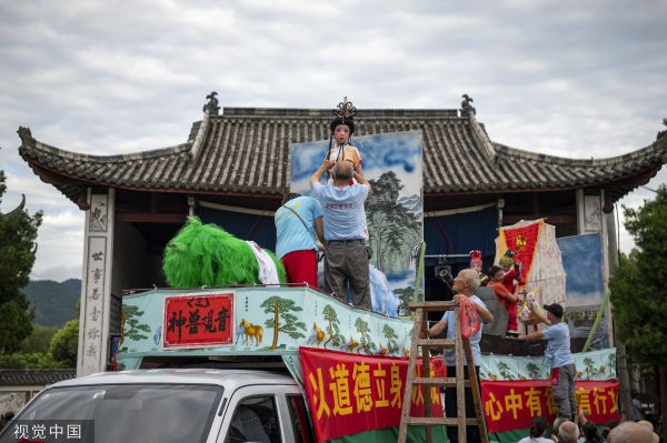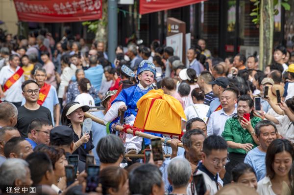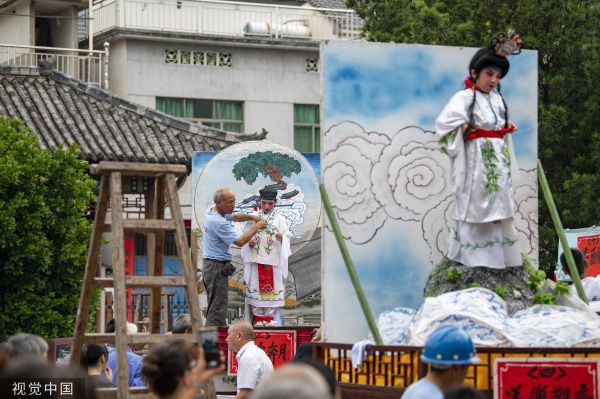 2023年7月3日,浙江金华,武义县柳城畲族镇老街上,各地游客和当地居民在观看浙江省非物质文化遗产——擎台阁(亦称宣平台阁)。
