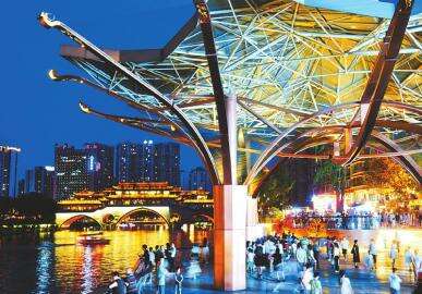 廊桥旁的音乐广场,是一幅霓虹灯下的成都市井生活画卷。