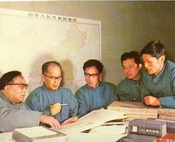 ▲1970年代后期,谭其骧与历史地理研究室同事研究《中国历史地图集》修订(左起吴应寿、谭其骧、邹逸麟、王文楚、周维衍)
