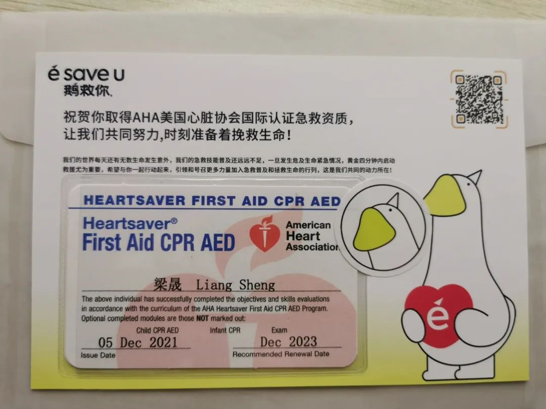 (梁晟自考AHA美国心脏协会国际认证急救资质的证书)