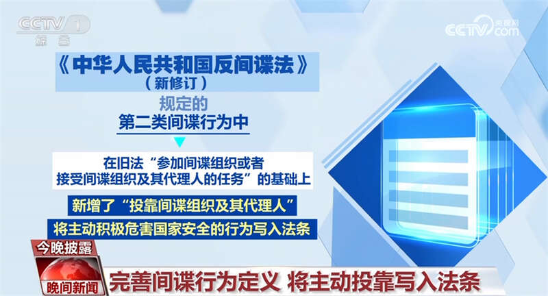 与此同时,在新《反间谍法》规定的第二类间谍行为中,在旧法“参加间谍组织或者接受间谍组织及其代理人的任务”的基础上,新增了“投靠间谍组织及其代理人”,将主动积极危害国家安全的行为写入法条。