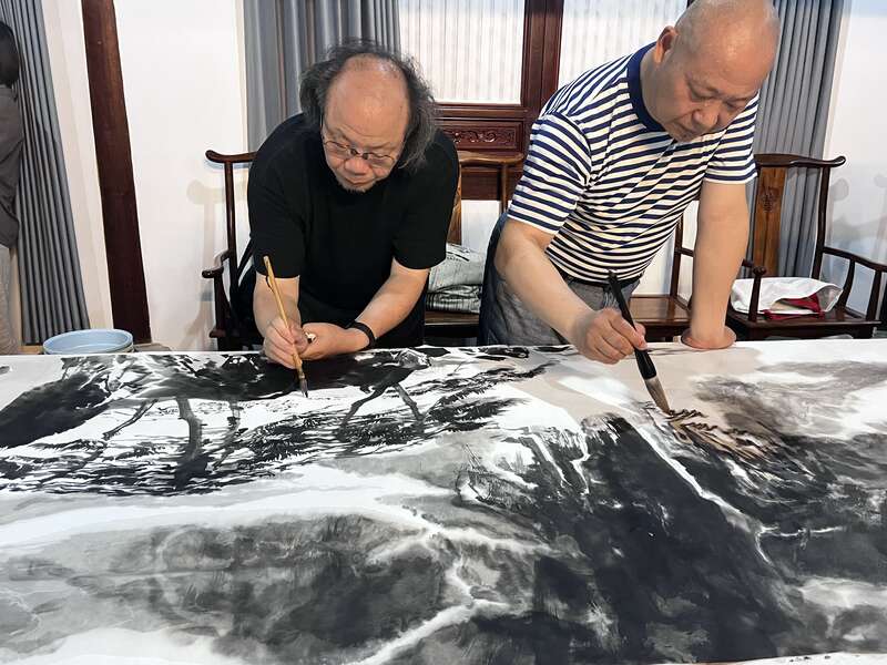 图四:画家、书法家在新登古镇即兴创作。中青报·中青网记者 李剑平/摄