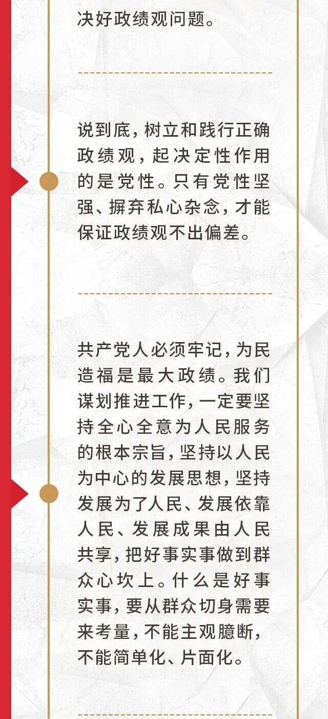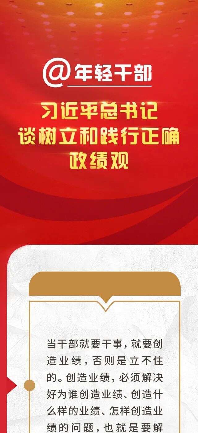 在2023年第13期《求是》杂志刊发的习近平总书记重要文章《努力成长为对党和人民忠诚可靠、堪当时代重任的栋梁之才》中,总书记强调:“业绩都是干出来的,真干才能真出业绩、出真业绩”,年轻干部“一定要牢记创造业绩的目的是为人民谋利益,真正把心思和精力放在为党和人民干事创业上”,要“树立和践行正确政绩观”。