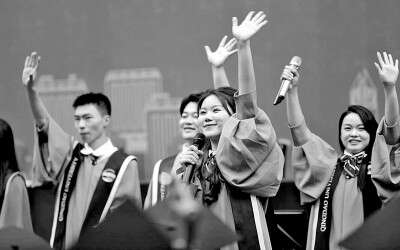 青岛大学毕业典礼现场,毕业学子唱响青春之歌。资料图片