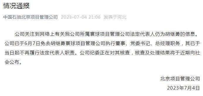 中国石油北京项目管理公司微信公众号7月4日发布情况通报称,公司关注到网络上有关我公司所属寰球项目管理公司法定代表人仍为胡继勇的信息。公司已于6月7日免去胡继勇寰球项目管理公司执行董事、党委书记、总经理职务,其已于当日起不再履行法定代表人职责。公司纪委正在对其核查,核查及处理结果将于近期向社会公布。