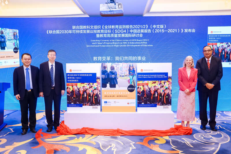 中国青年报客户端讯(中青报·中青网记者 叶雨婷)7月4日,联合国教科文组织《全球教育监测报告2021/2》中文版和《联合国2030年可持续发展议程教育目标(SDG 4)中国进展报告(2015—2021)》发布会暨教育高质量发展国际研讨会在北京举办。教育部副部长王嘉毅、联合国教科文组织教育助理总干事斯蒂芬妮亚·贾尼尼出席会议并致辞。