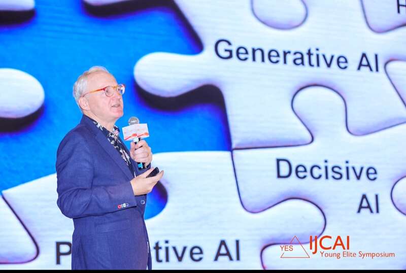 华东师范大学信息学部主任、2023 IJCAI YES大会程序委员会中方主席张桂戌教授介绍了本次会议中最令人值得期待的几个环节——五大主旨演讲、两大论坛、54 个学术报告以及一个对谈。