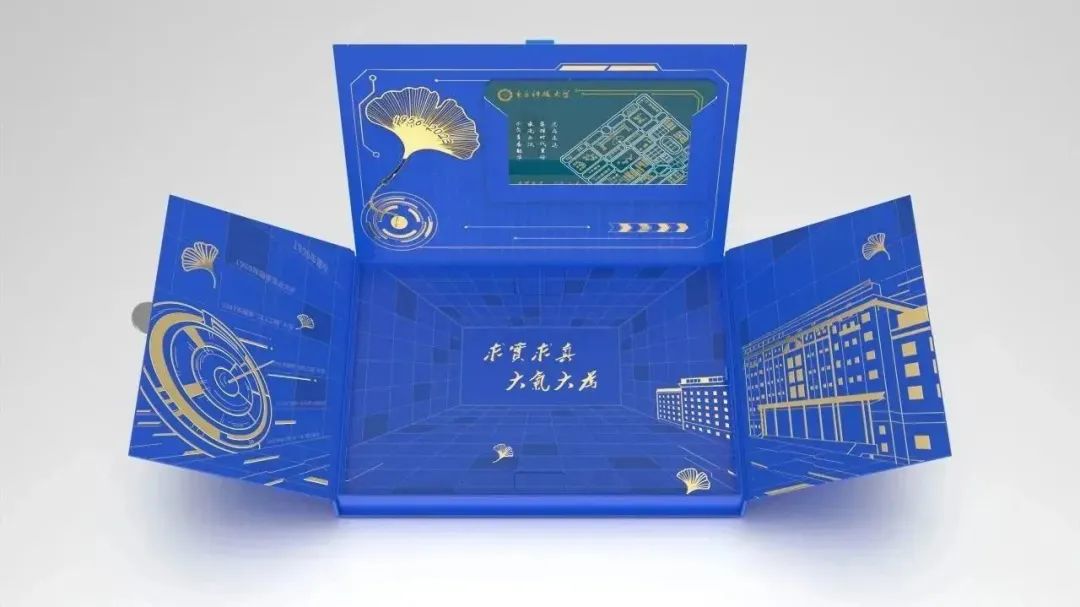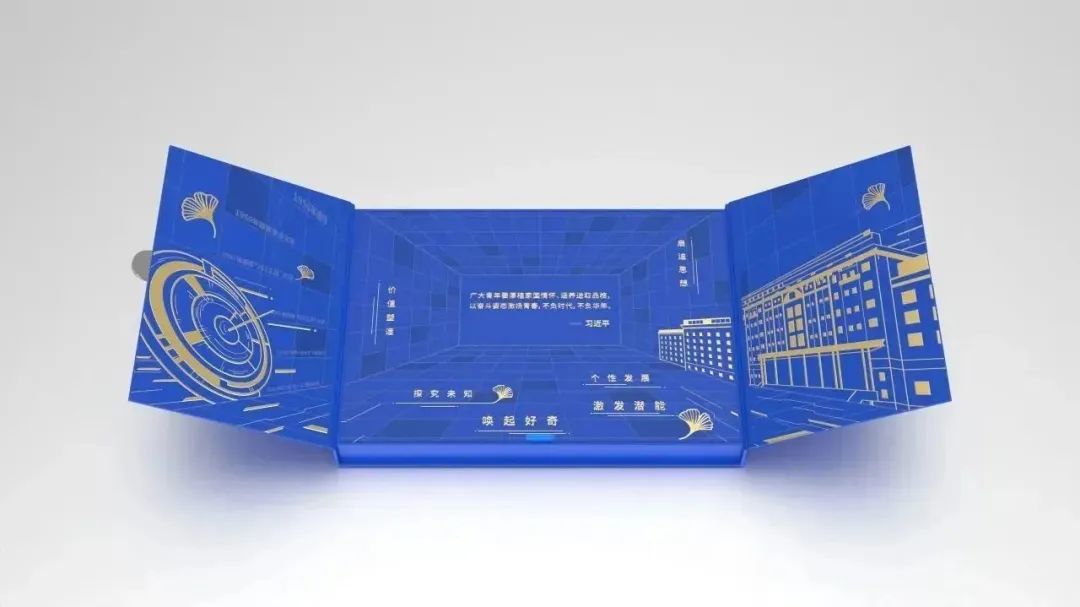 通知书礼盒中有银杏叶书签、AR电路板等。