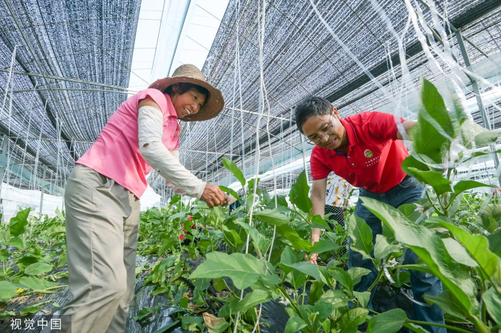 2023年7月7日,江西吉安,江西农业大学马克思主义学院的大学生正在新干县沂江乡曾家村蔬菜大棚向基地农民宣传“中央一号文件”惠农政策。