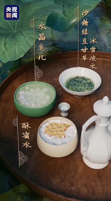 消暑冰饮:据宋代《东京梦华录》记载,当时人们的消夏冷食有冰雪冷元子、水晶皂儿、生淹水木瓜、绿豆甘草冰雪凉水等。